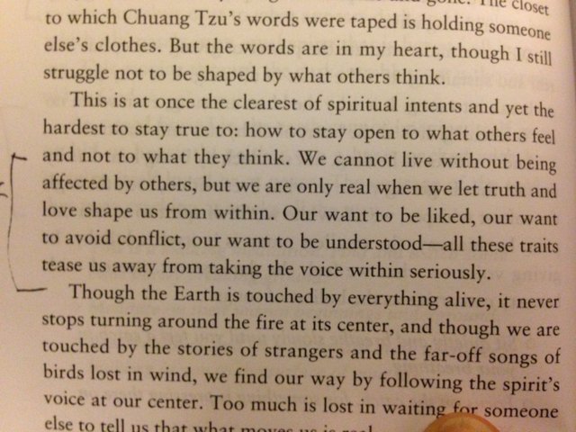 “We cannot live without being affected by others, but we are only real when we let truth and love shape us from within.  Our want to be liked, our want to avoid conflict, our want to be understood — all these traits tease us away from taking the voice within seriously.”