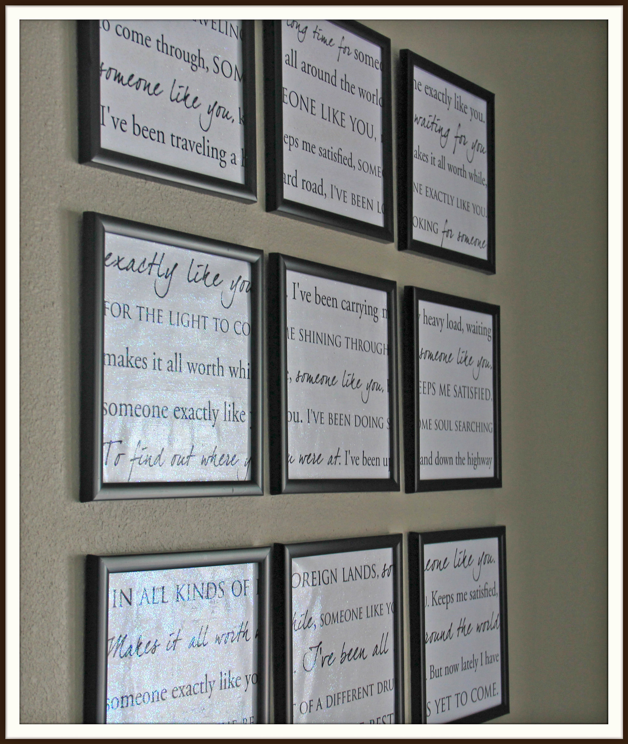 … PERFECT! Lyrics to our wedding song, mod-podged with sparkle. I didn’t use the glass of the frames.